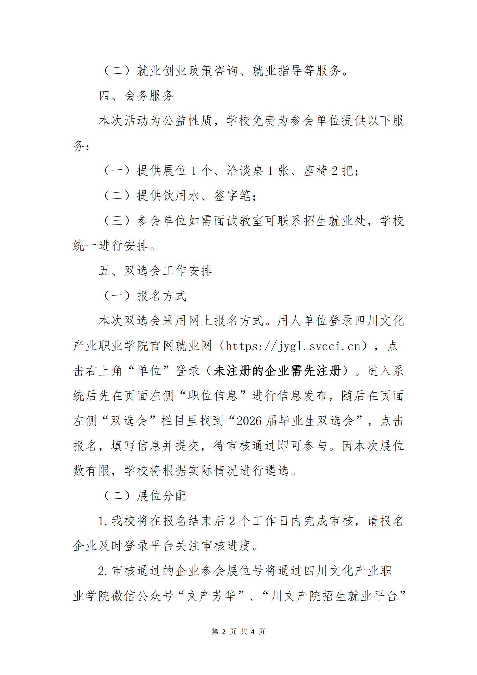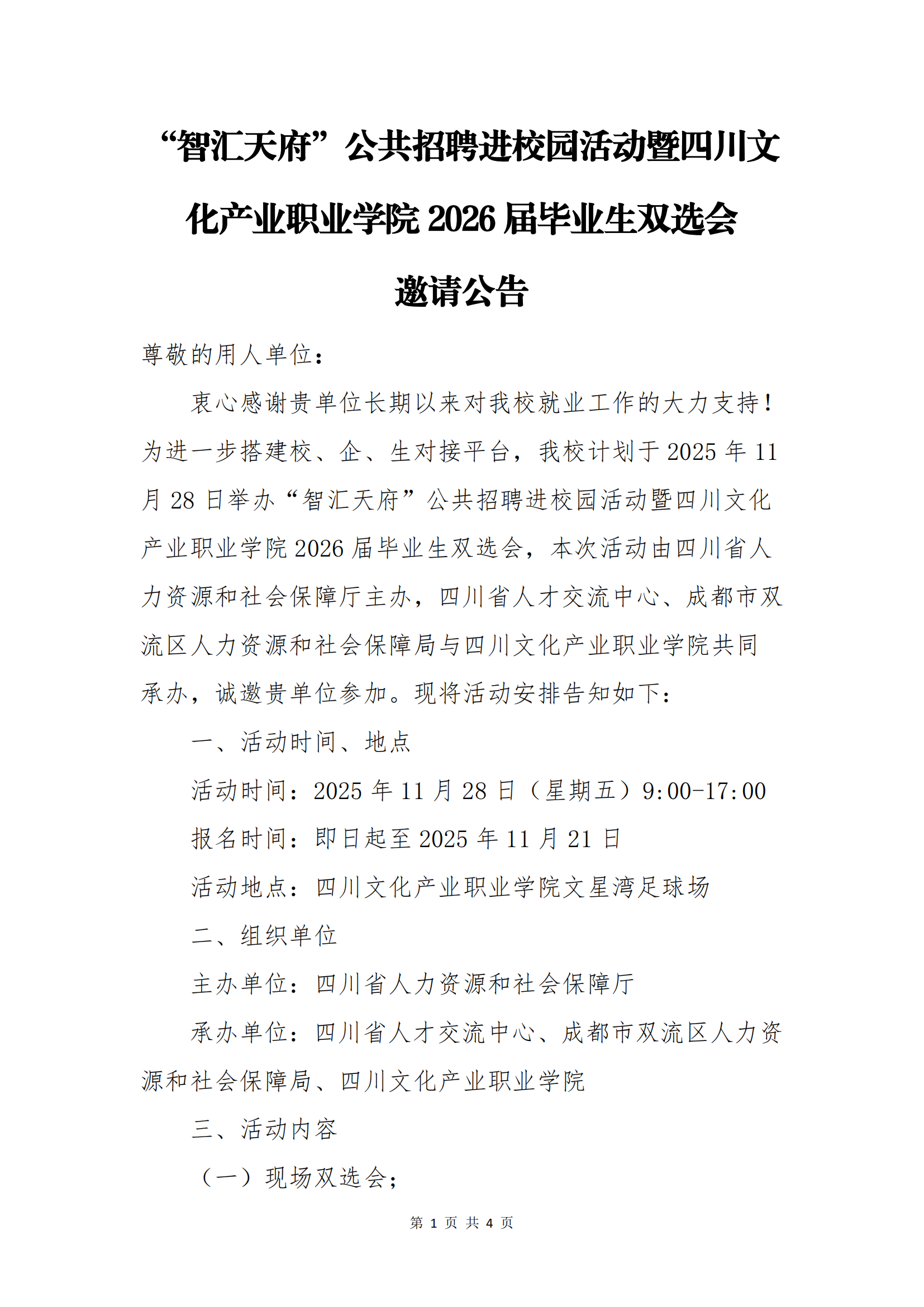 “智汇天府”公共招聘进校园活动暨四川文 化产业职业学院 2026 届毕业生双选会 邀请公告